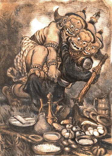Шибко удивляется жена богача и много еды ставит перед Будамшу. Так смекалистый Будамшу и наелся досыта.