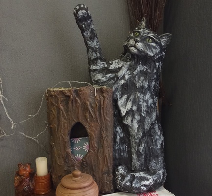 Но это ещё не всё. Напротив стула оформлен уголок кота Баюна с заповедным дуплом, в котором можно положить записку с пожеланием таких изменений в жизни людей в 2026 году, которые помогут исполнению личного желания. А чтобы всё осуществилось, можно позвонить в колокольчик Деда Мороза из Великого Устюга, который находится тут же.